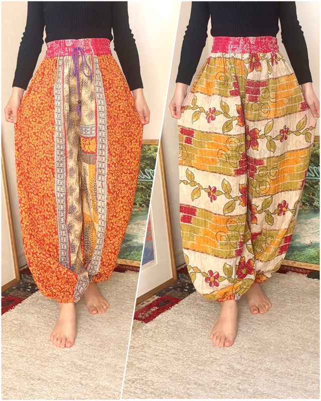 可愛いサイドポケットタイプの厚手カンタアラジンパンツです♡ やっぱりアラジンパンツ!のご要望をいただき 、ワイドパンツからのリメイクしたお品です✴︎そのため裾ゴムに従来品より少し厚みがあり、通常の厚手アラジンより10%オフとさせていただいております✴︎ 【厚手タイプ旅する魔法のアラジンパンツ】 コットンサリーを3〜4枚重ねて刺し子した、厚手タイプのアラジンパンツです✴︎ 着画はモデル身長164cmの着用感です✴︎ ウエストゴム 約67〜80cm (紐で調節可能) ワタリ周り 約80cm 総丈 約100cm 股下 約65cm (ハンドメイド品のためサイズには若干の誤差があることがあります) コットンヴィンテージカンタ/100%