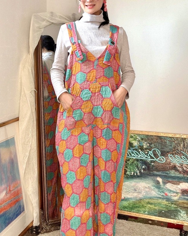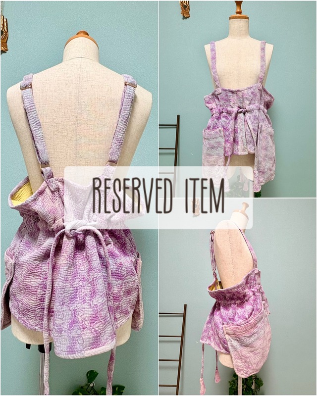 コットンサリーを3〜4枚重ねて刺し子されたふんわりカンタで作った、色柄どれも世界にひとつだけのサロペット♬ おなかのカンガルーポケットの他に両サイドにもシームポケットが付いています♬ 肩紐を留めるボタンは、ボタン穴で長さが3段階に調節できます✴︎ ウエストの幅もドロストで絞ることができます✴︎ 裾にも2〜3cm裾を上げられるドロスト紐が付いており、必要のない方は切っていただいても大丈夫です✴︎ 【カンタサロペット】 肩紐ボタン部分からの総丈約118cm ウエスト約115cm(約70cmくらいまで絞ることが可能) ヒップ約120cm 股下約58cm 裾幅約30cm(裾周り約60) ※ハンドメイド生地を使用しているため、サイズには数センチの誤差があることがあります。