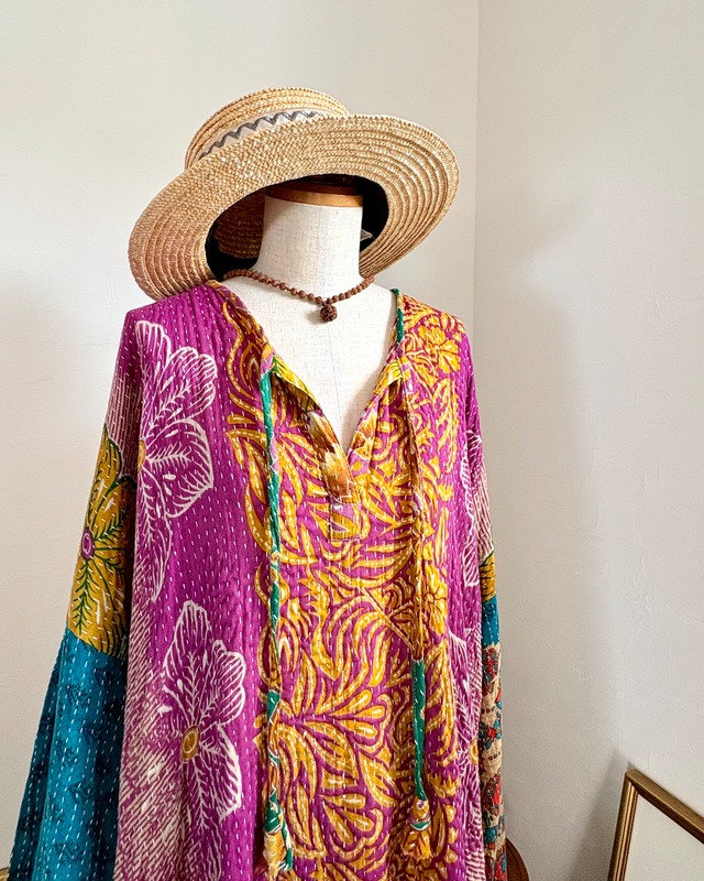 ワクワクの予感がする日の美しい朝日のようなイエローと裾と袖のブルーやオレンジのカラー、周囲までパッと明るくなる素敵な一品です♡ 【ハートくつろぐワンピース/サイズ詳細】 総丈/約120cm 身幅平置き/約62cm コットン100%