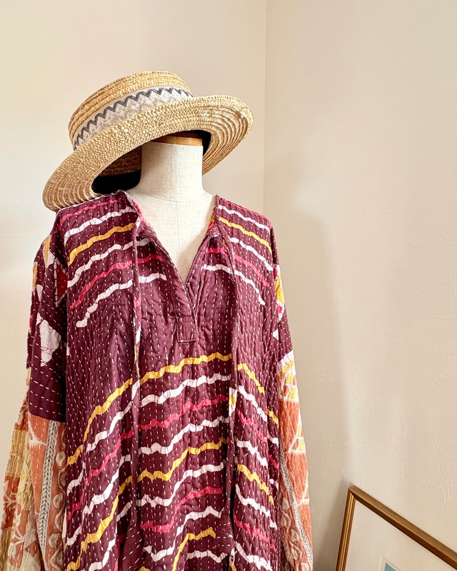 落ち着いたアズキカラーに差し色のボーダーと、袖と裾のヴィンテージ感が可愛い、素敵な一品です♡ 【ハートくつろぐワンピース/サイズ詳細】 総丈/約120cm 身幅平置き/約62cm コットン100%