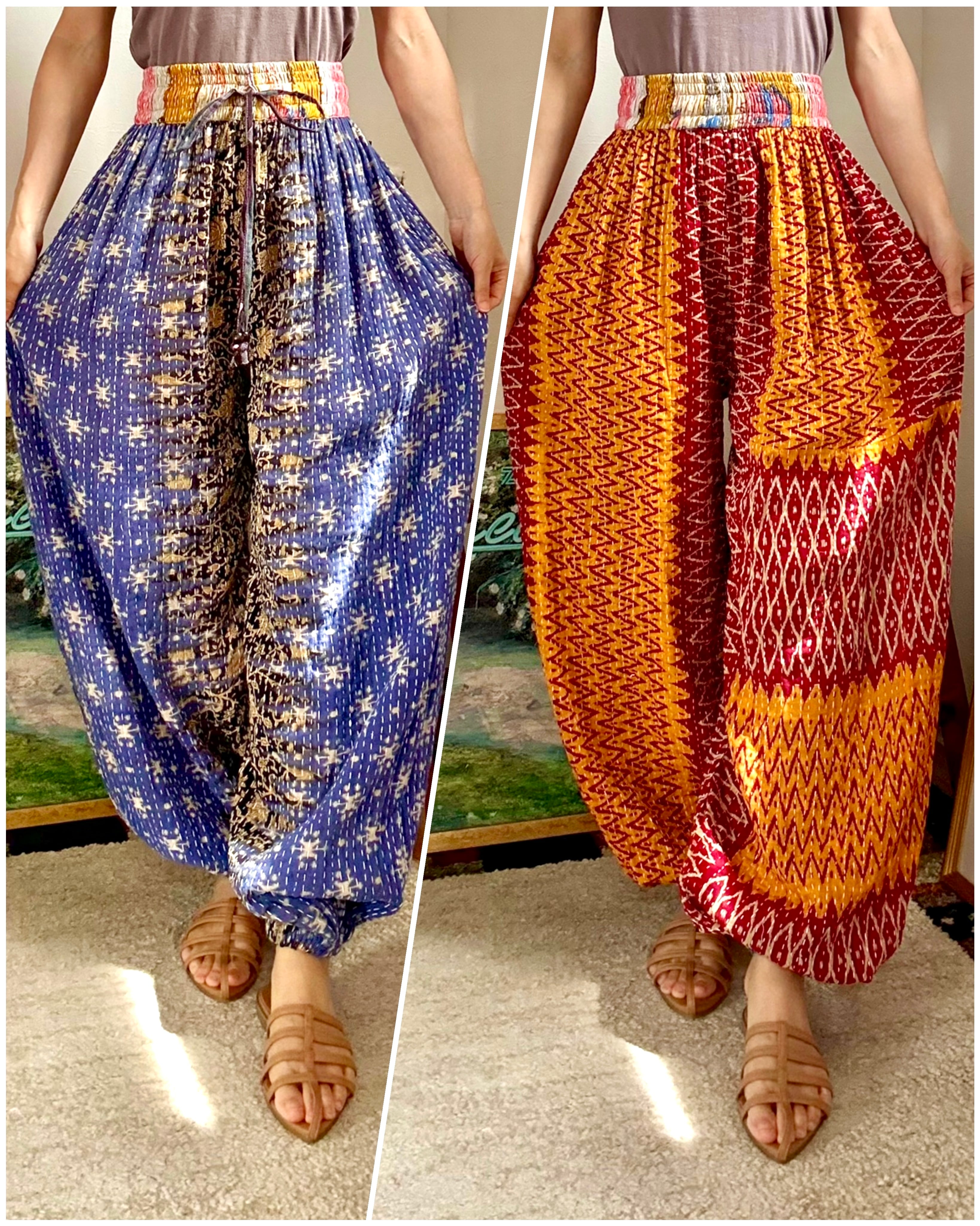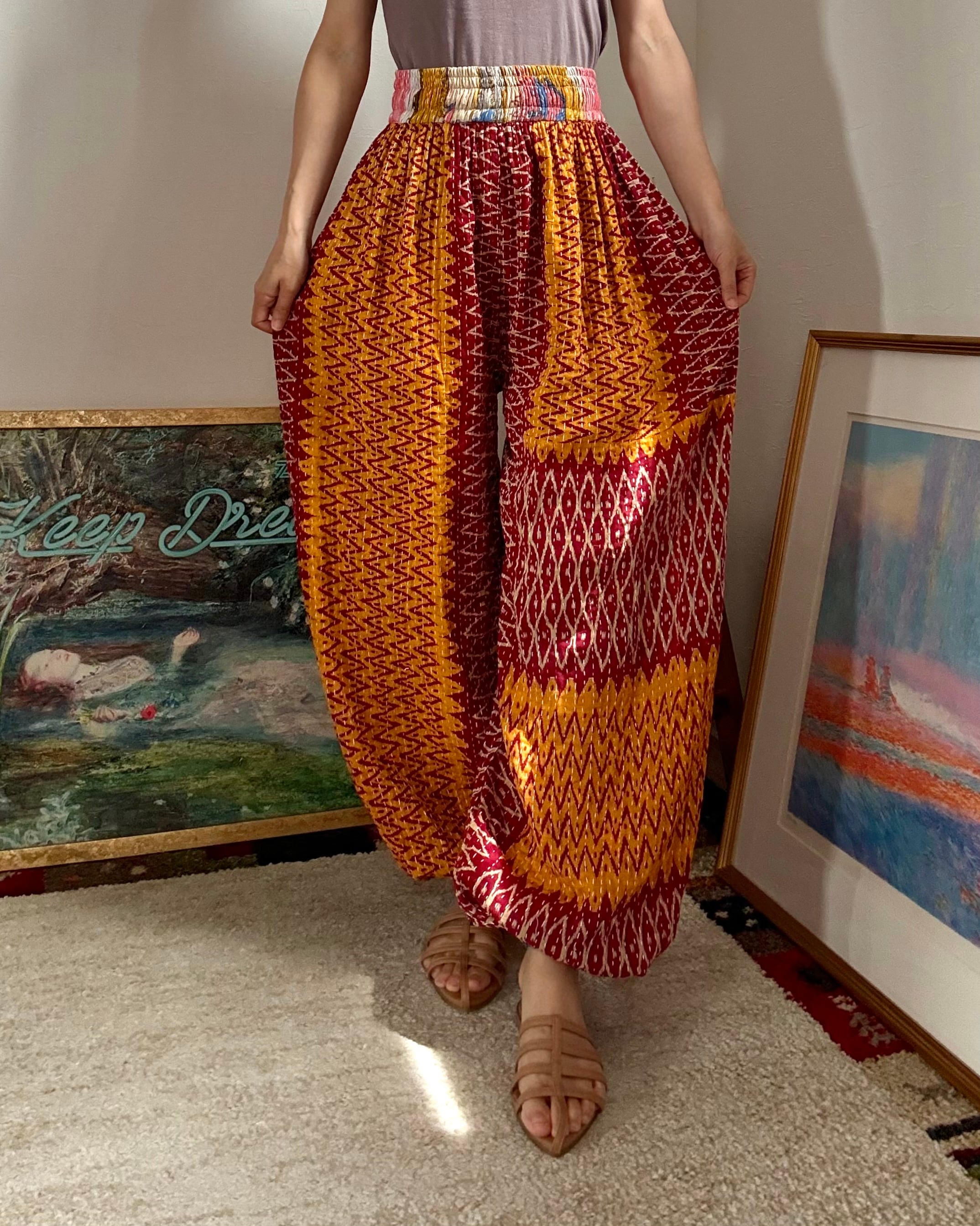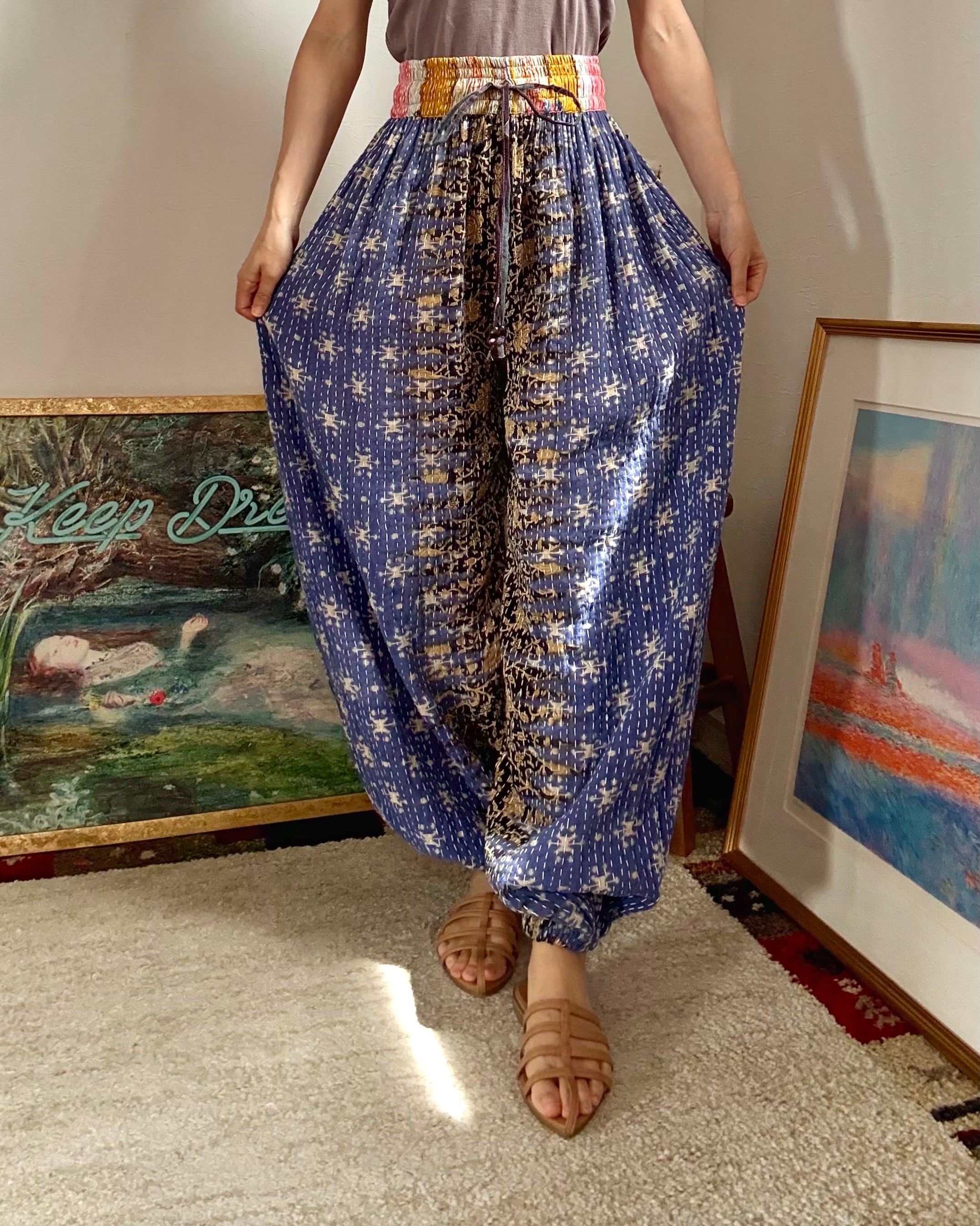 こちらはコットンサリーを2枚重ねて刺し子した、薄手タイプのアラジンパンツです✴︎