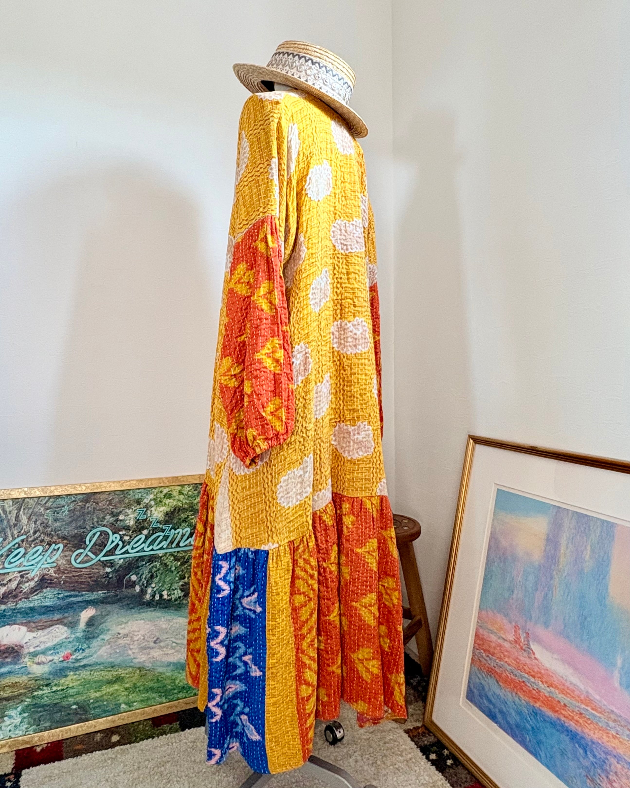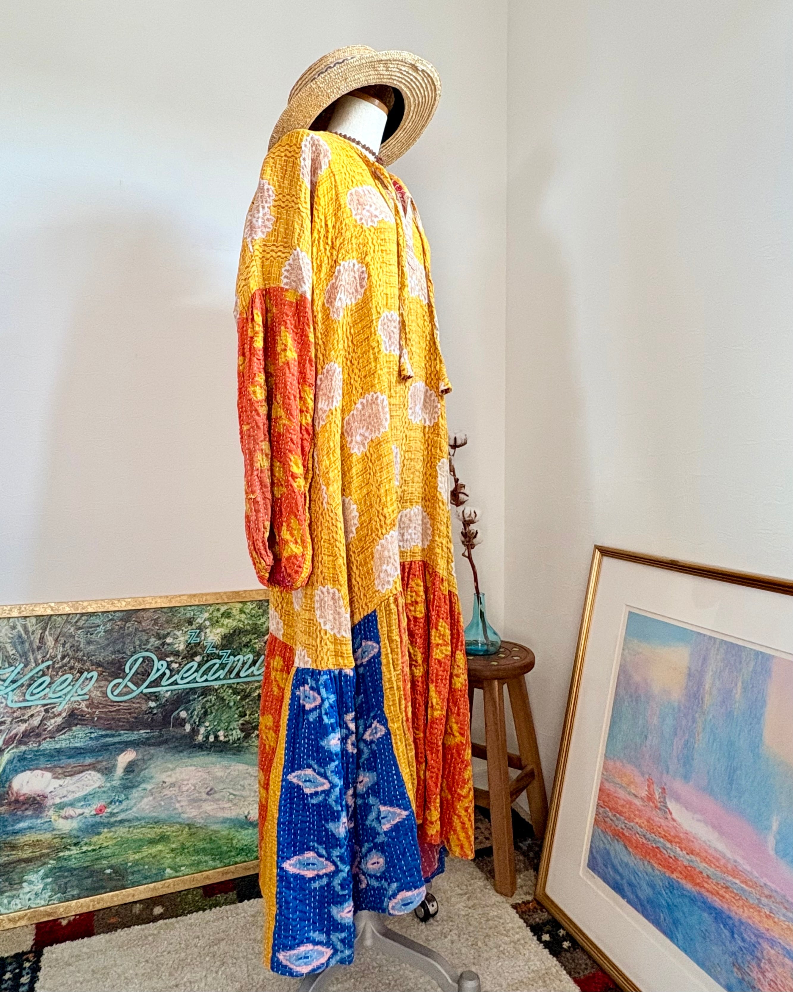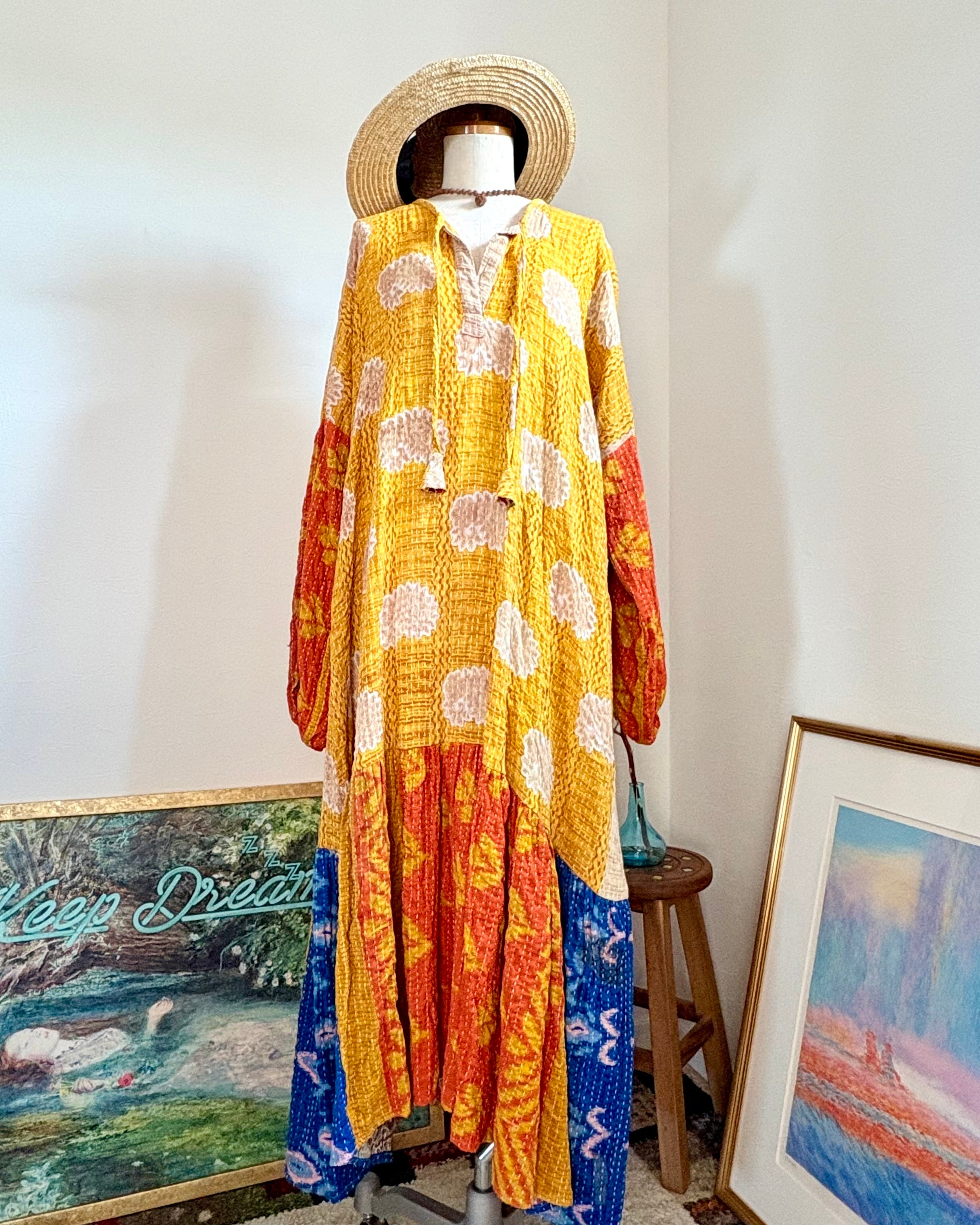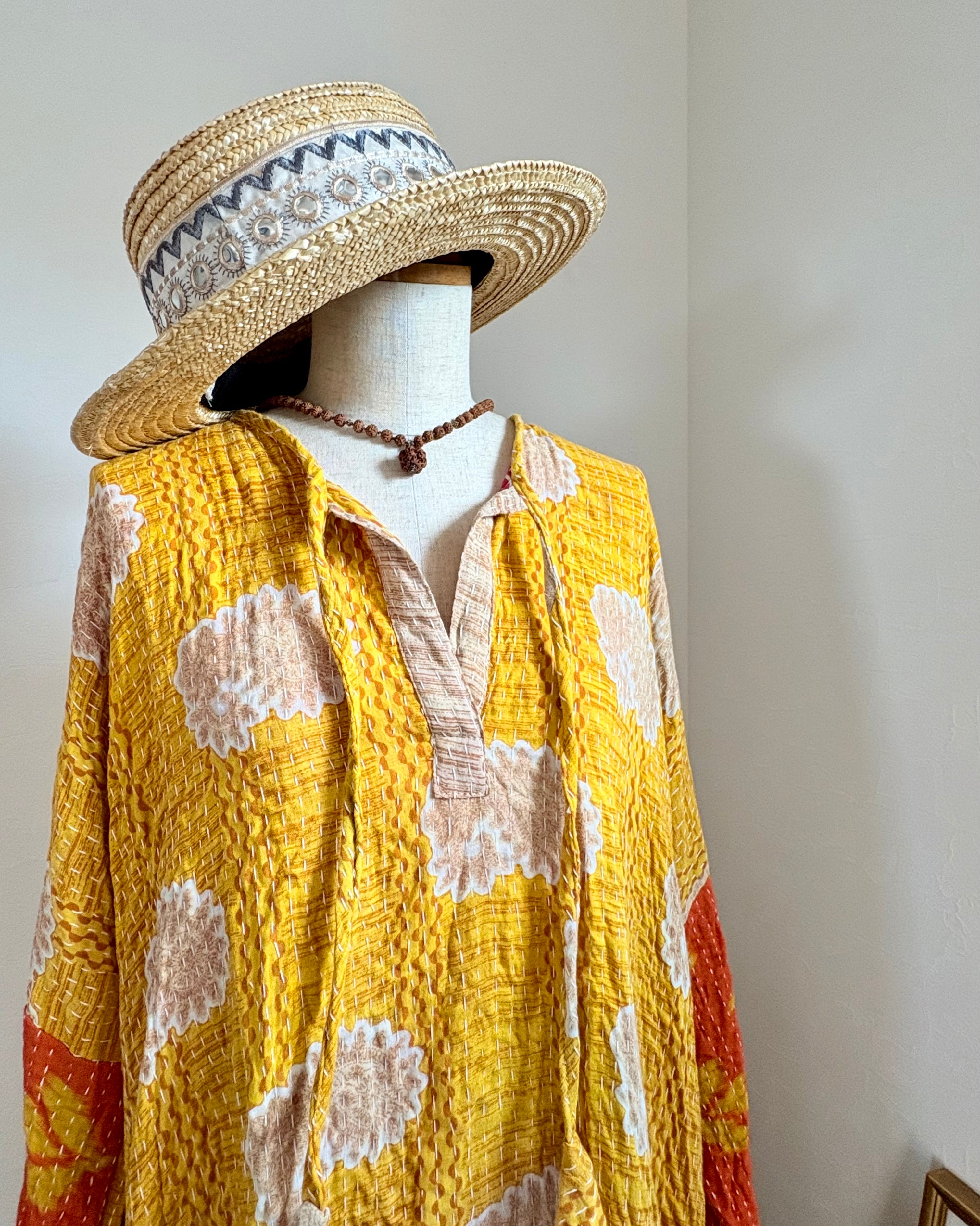 ワクワクの予感がする日の美しい朝日のようなイエローと裾と袖のブルーやオレンジのカラー、周囲までパッと明るくなる素敵な一品です♡