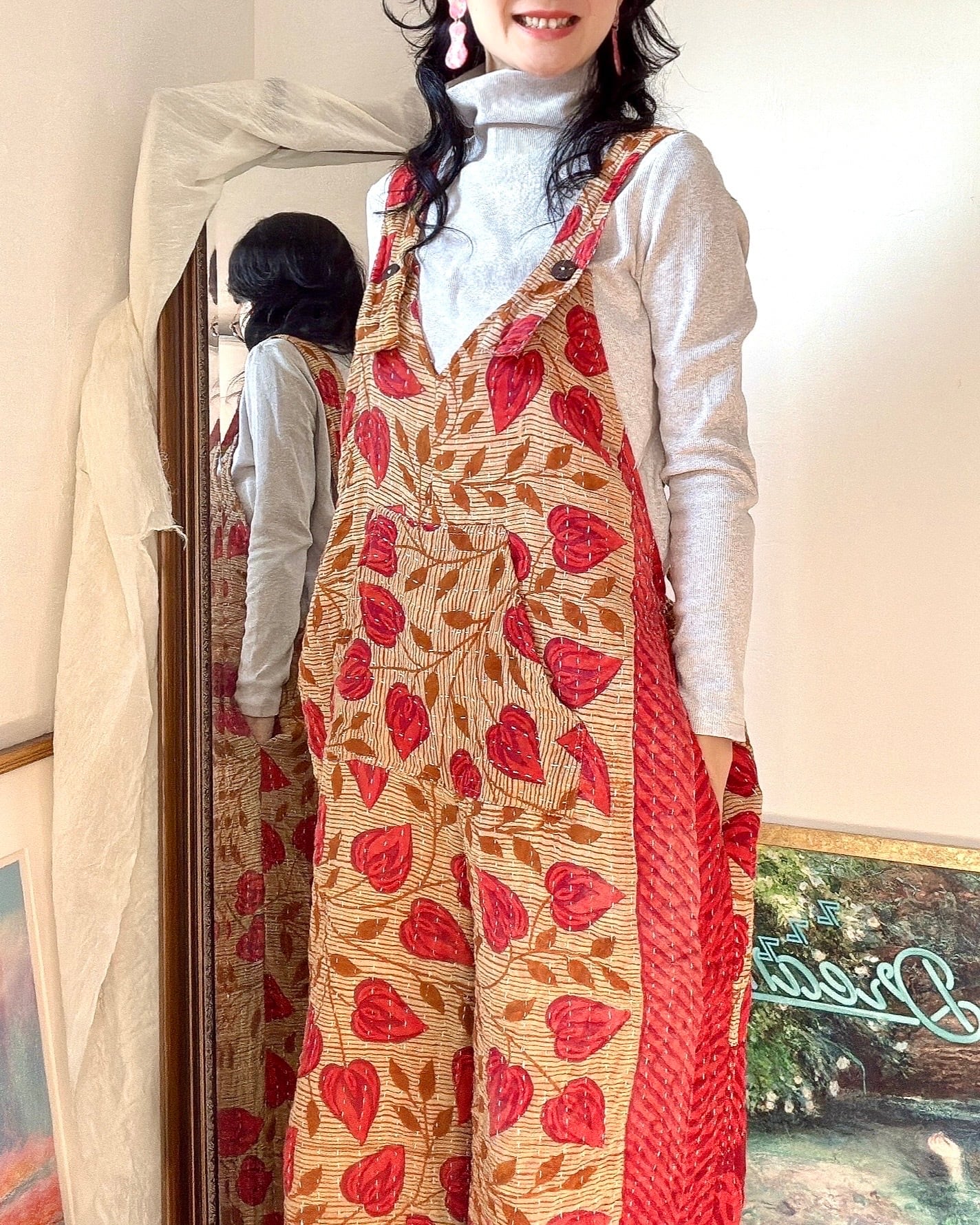 コットンサリーを3〜4枚重ねて刺し子されたふんわりカンタで作った、色柄どれも世界にひとつだけのサロペット♬