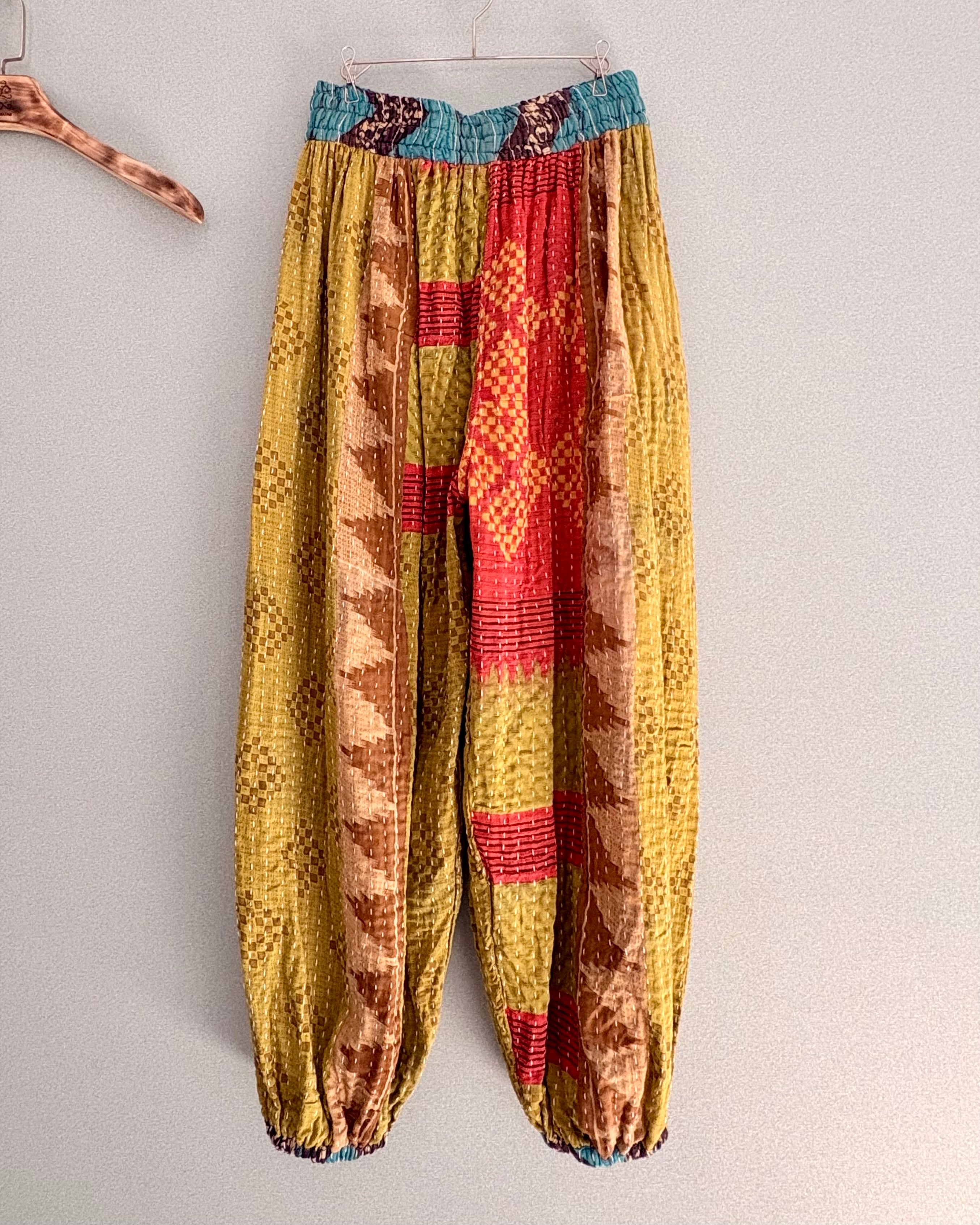 ヴィンテージコットンサリーを3〜4枚重ねて刺し子した、厚手タイプのアラジンパンツです✴︎