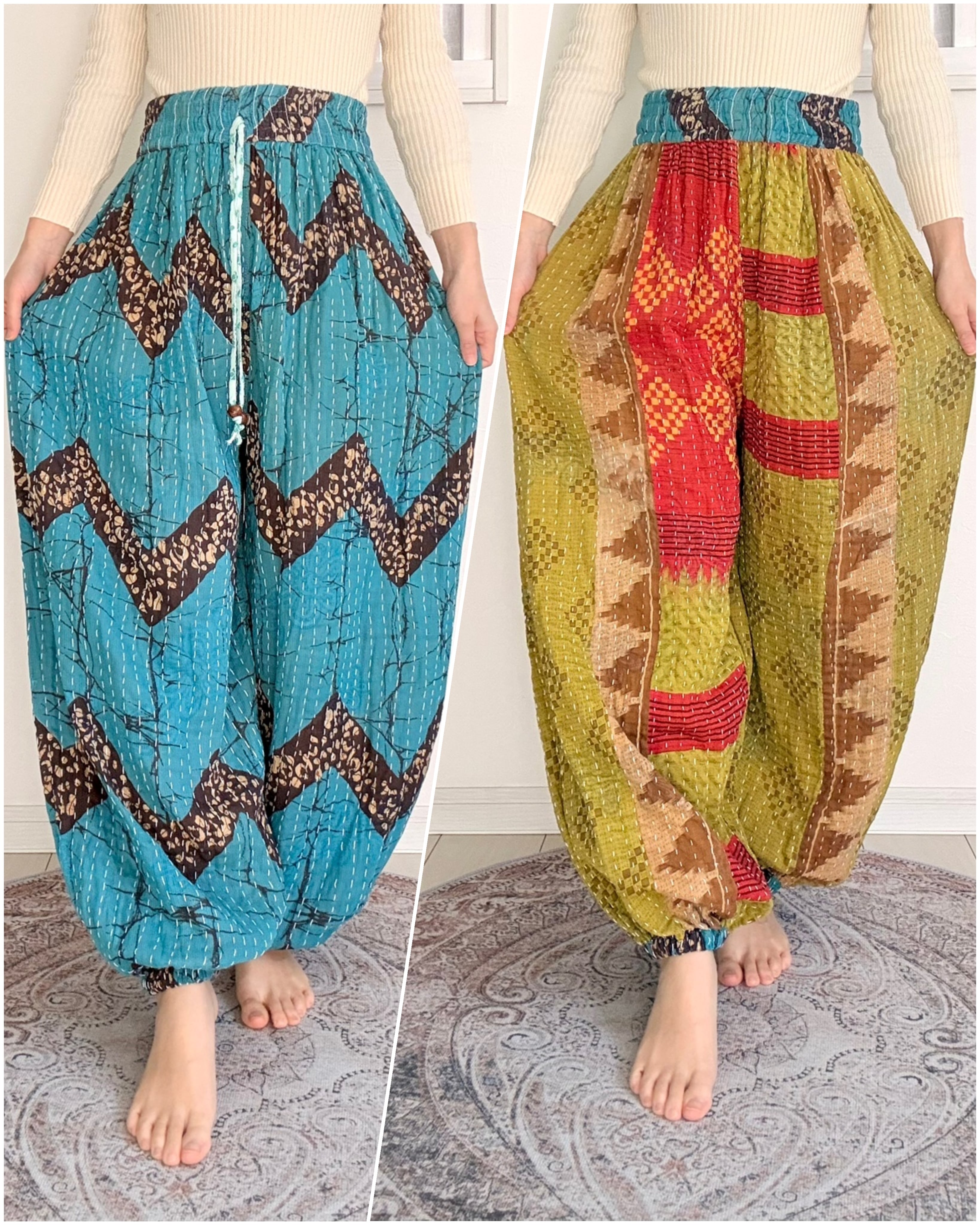 Thick type Aladdin trousers sewn with 3-4 layers of vintage cotton saris. ✴︎