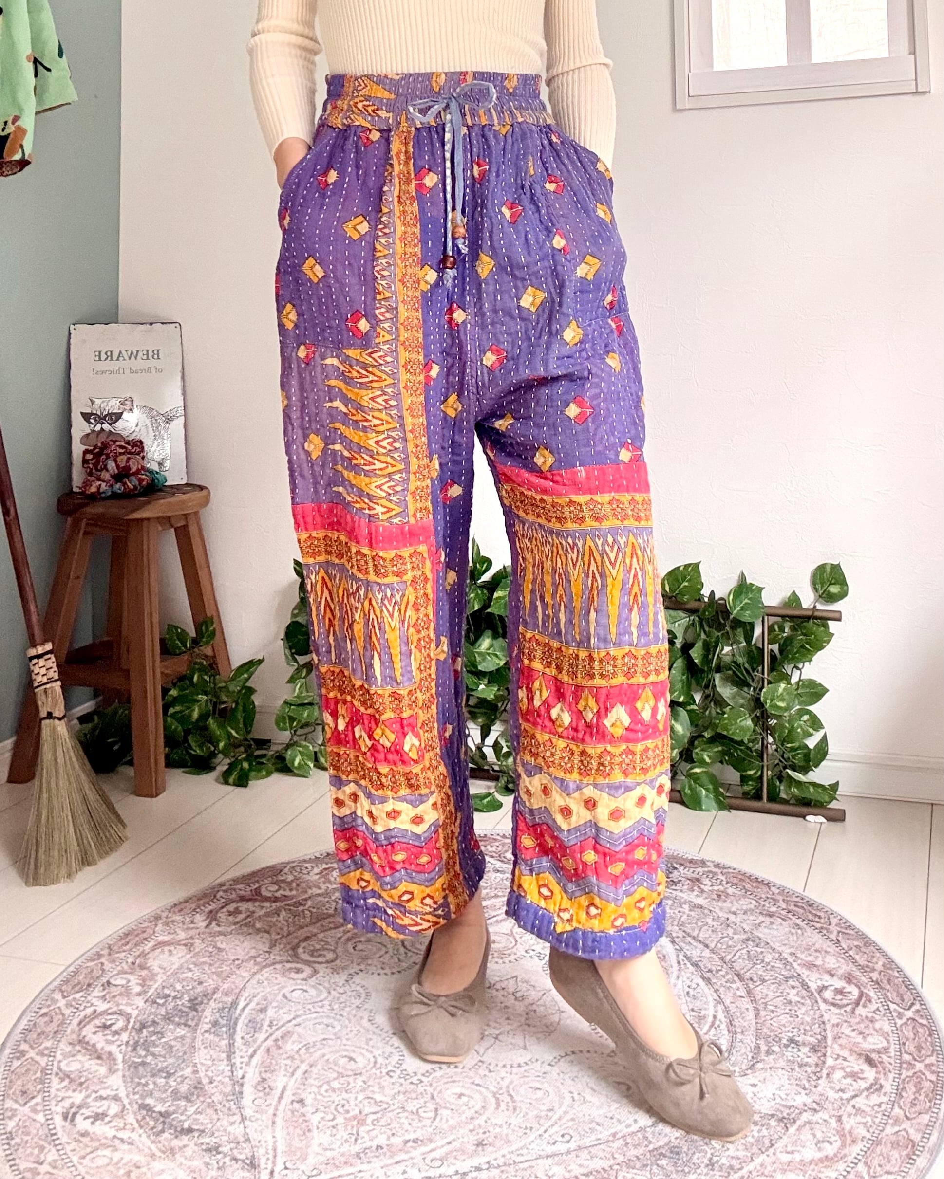 ヴィンテージコットンサリーを3枚重ね刺し子したカンタのテーパードパンツです✴︎
