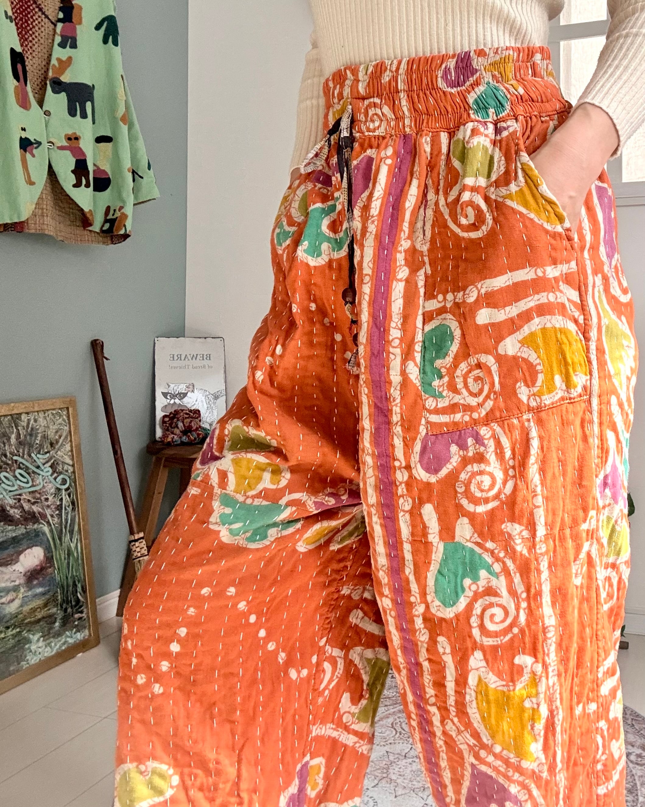 These tapered pants are made from three layers of vintage cotton sari fabric, stitched together with traditional kantha stitching.