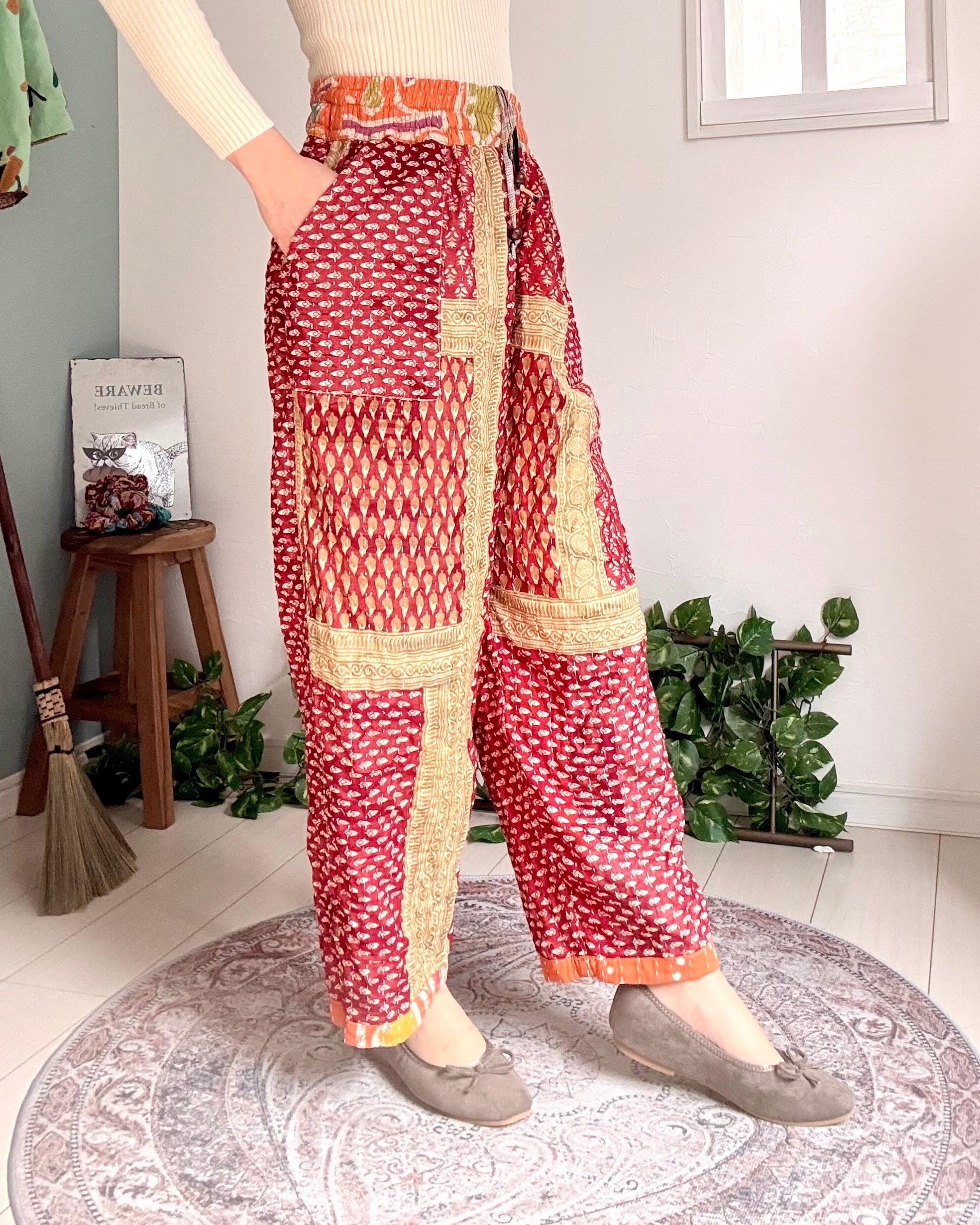 ヴィンテージコットンサリーを3枚重ね刺し子したカンタのテーパードパンツです✴︎