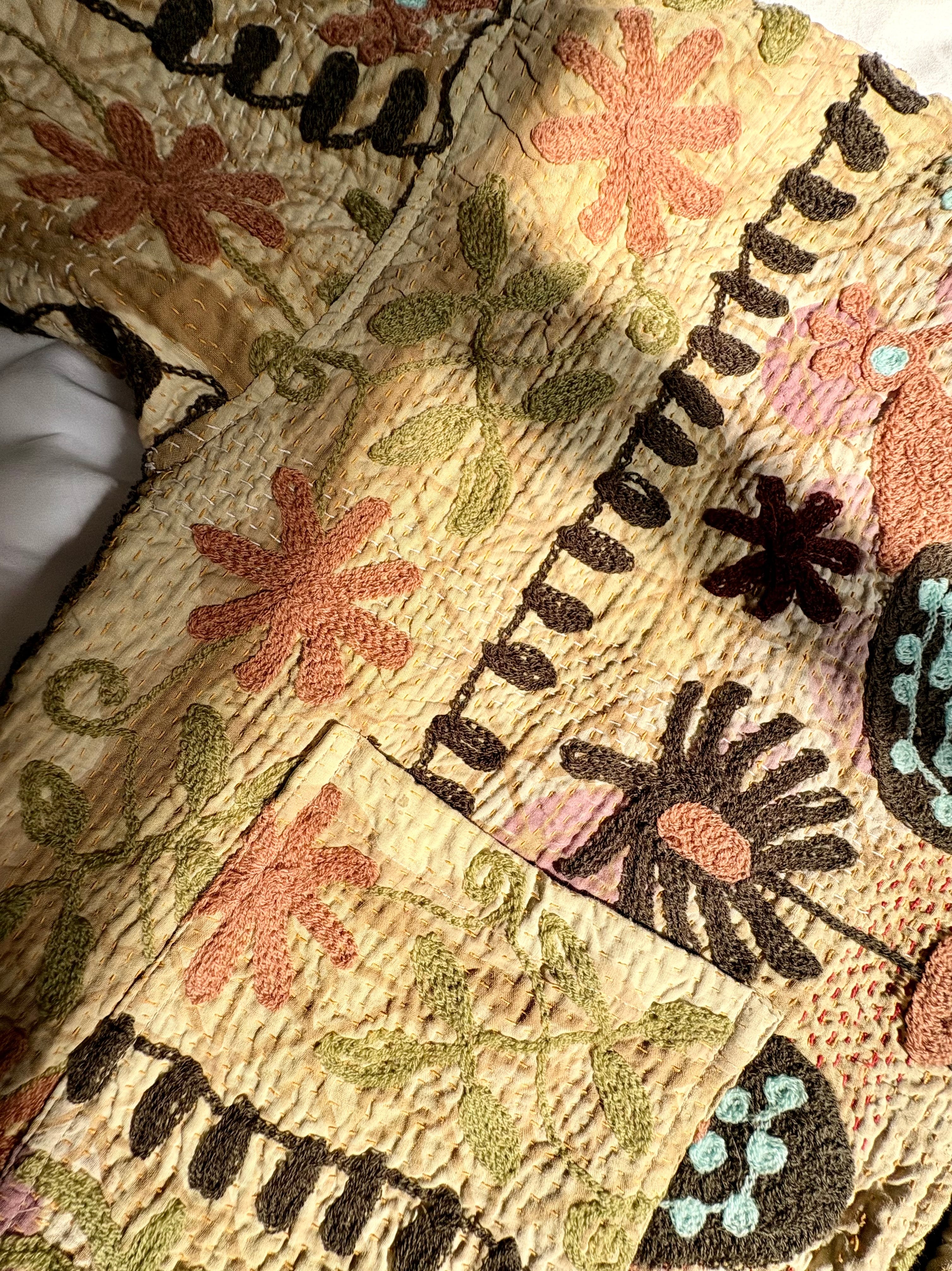 ユニークで可愛い動植物たち(パシュ)の物語が、細かな刺し子のカンタキルトの上に刺繍された、手間と時間をかけた贅沢な生地を使用して作った一点ものジャケットです✴︎