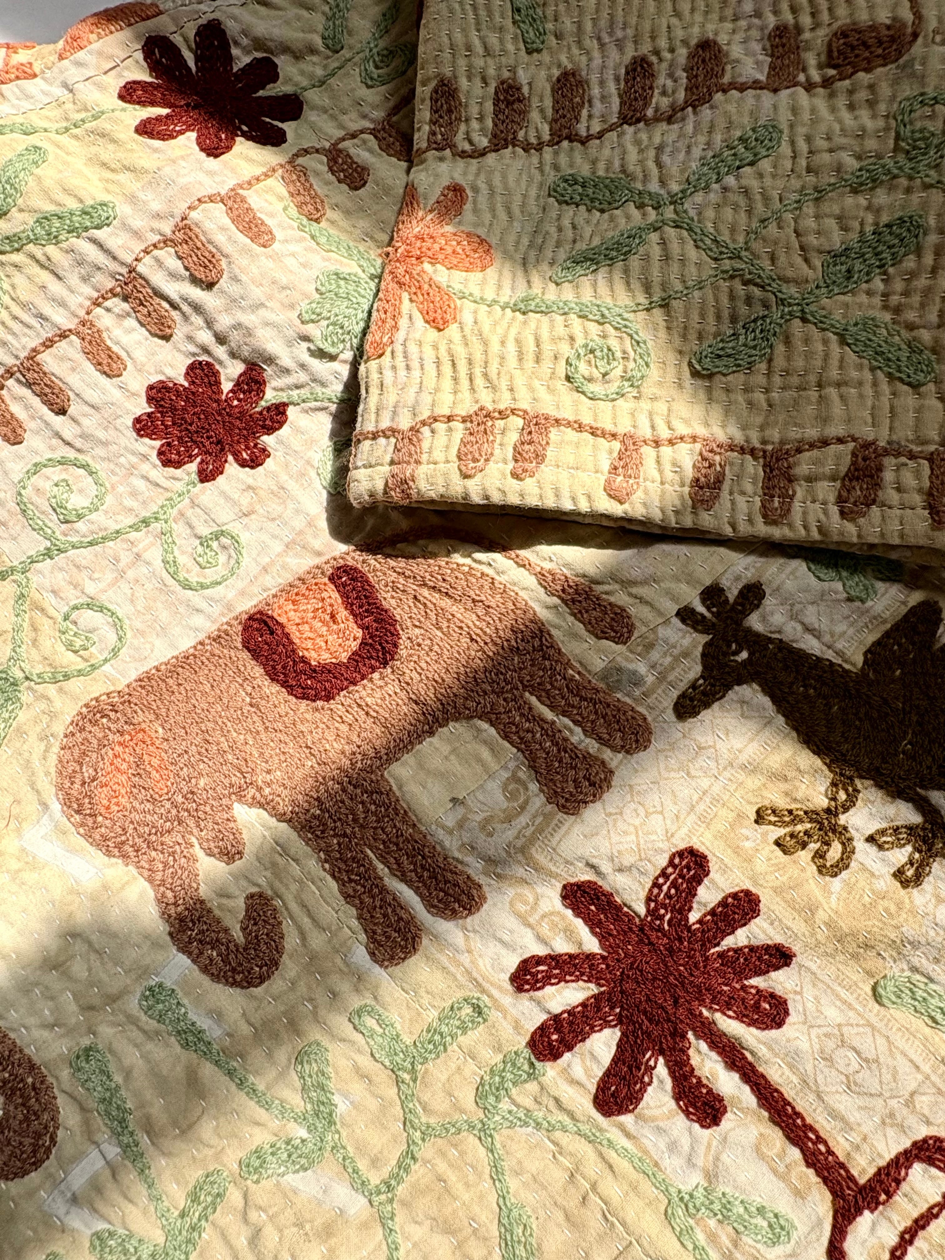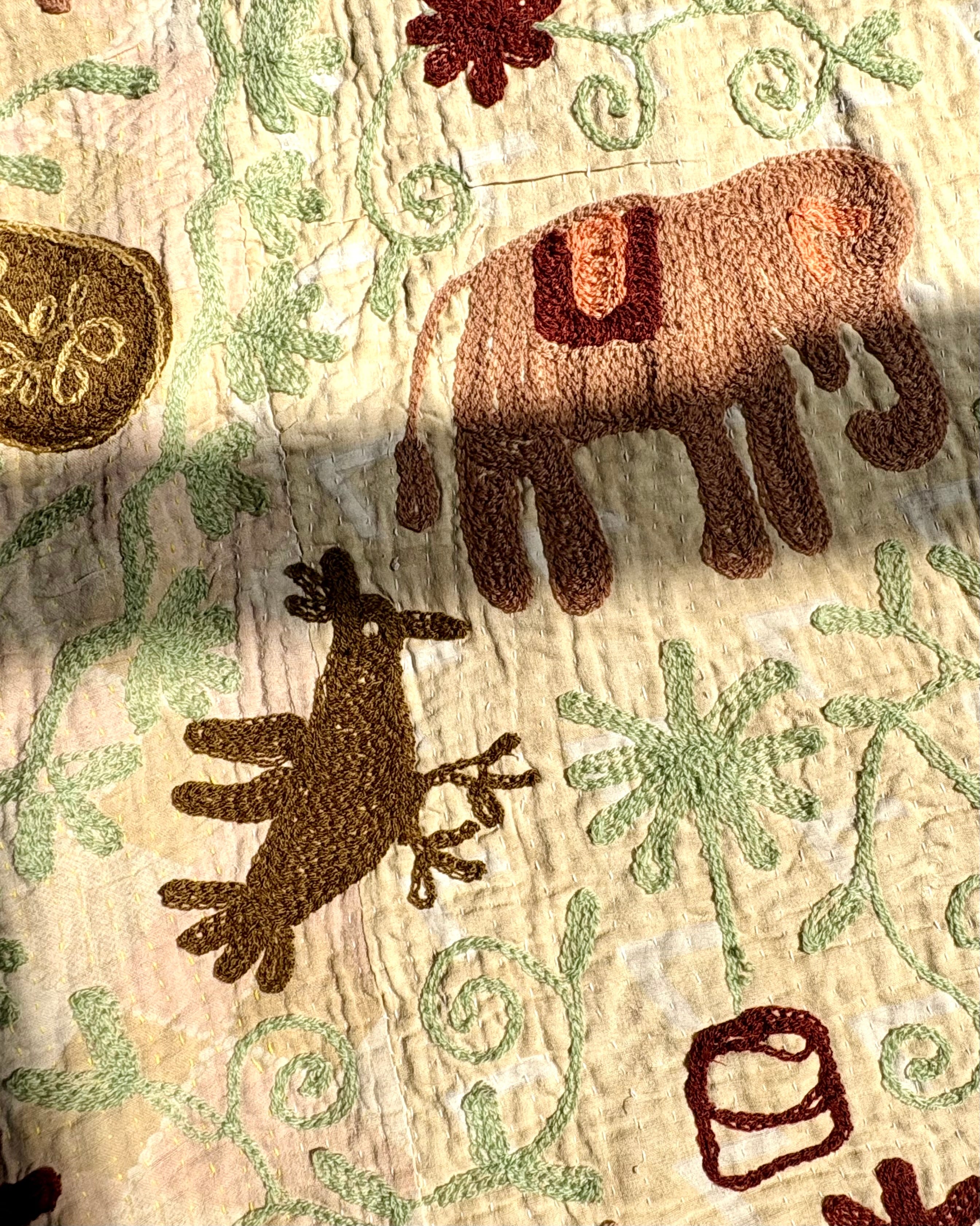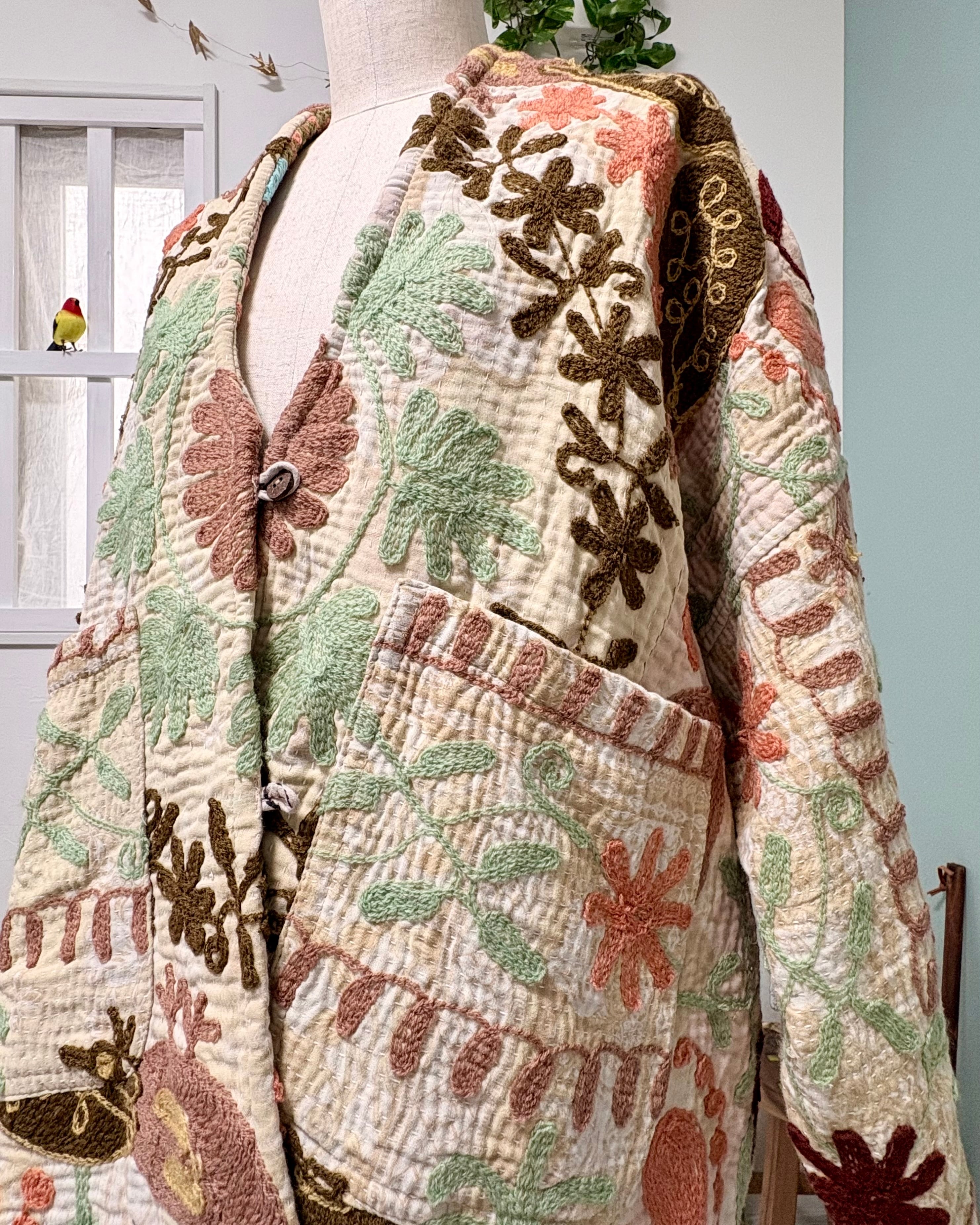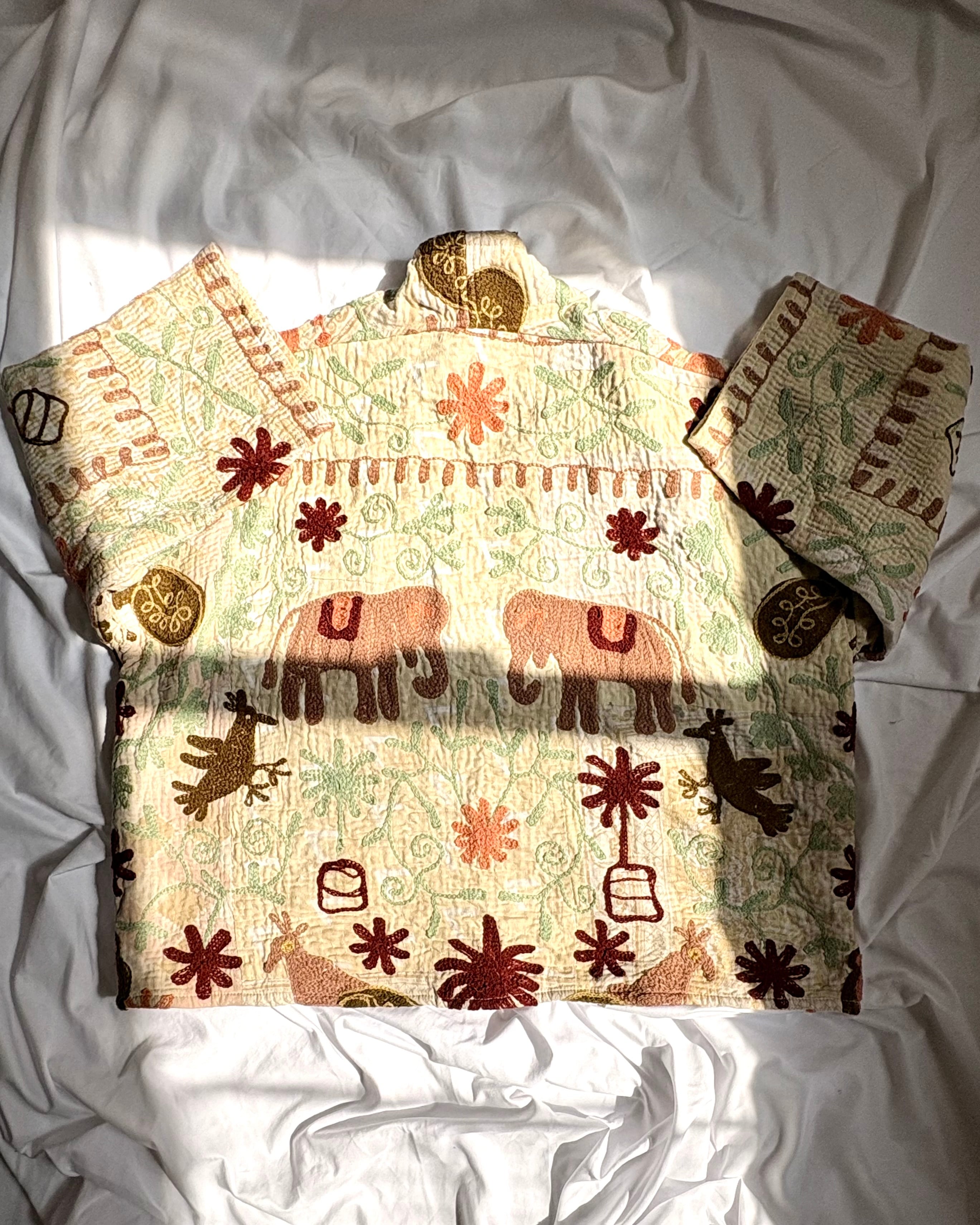 ユニークで可愛い動植物たち(パシュ)の物語が、細かな刺し子のカンタキルトの上に刺繍された、手間と時間をかけた贅沢な生地を使用して作った一点ものジャケットです✴︎