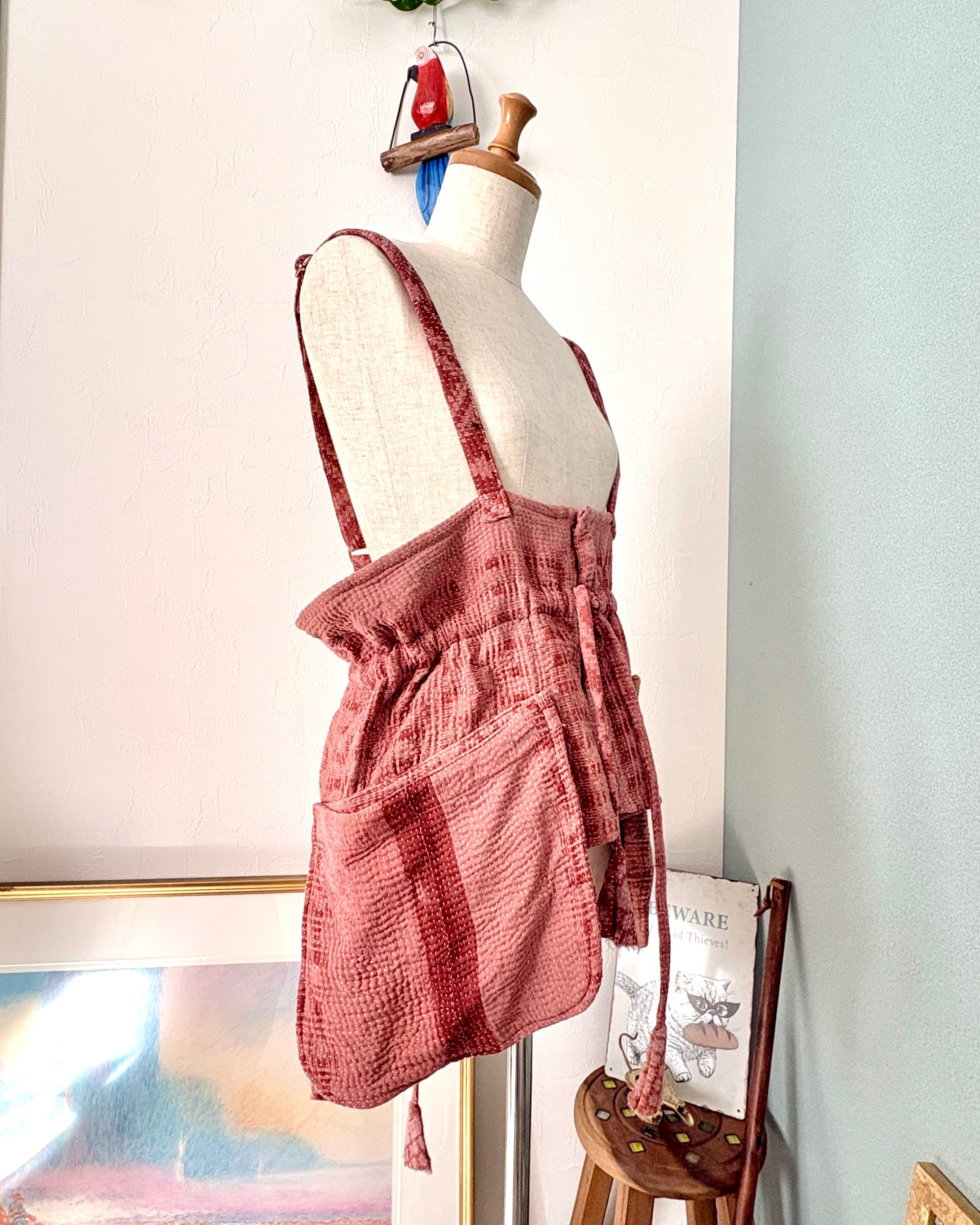 Each corset is made from luxurious vintage Kanta, created by layering 4–5 cotton saris and hand-quilting them together with fine, intricate stitching. The fabric carries the warmth of handwork and the quiet history of the women who made it.
