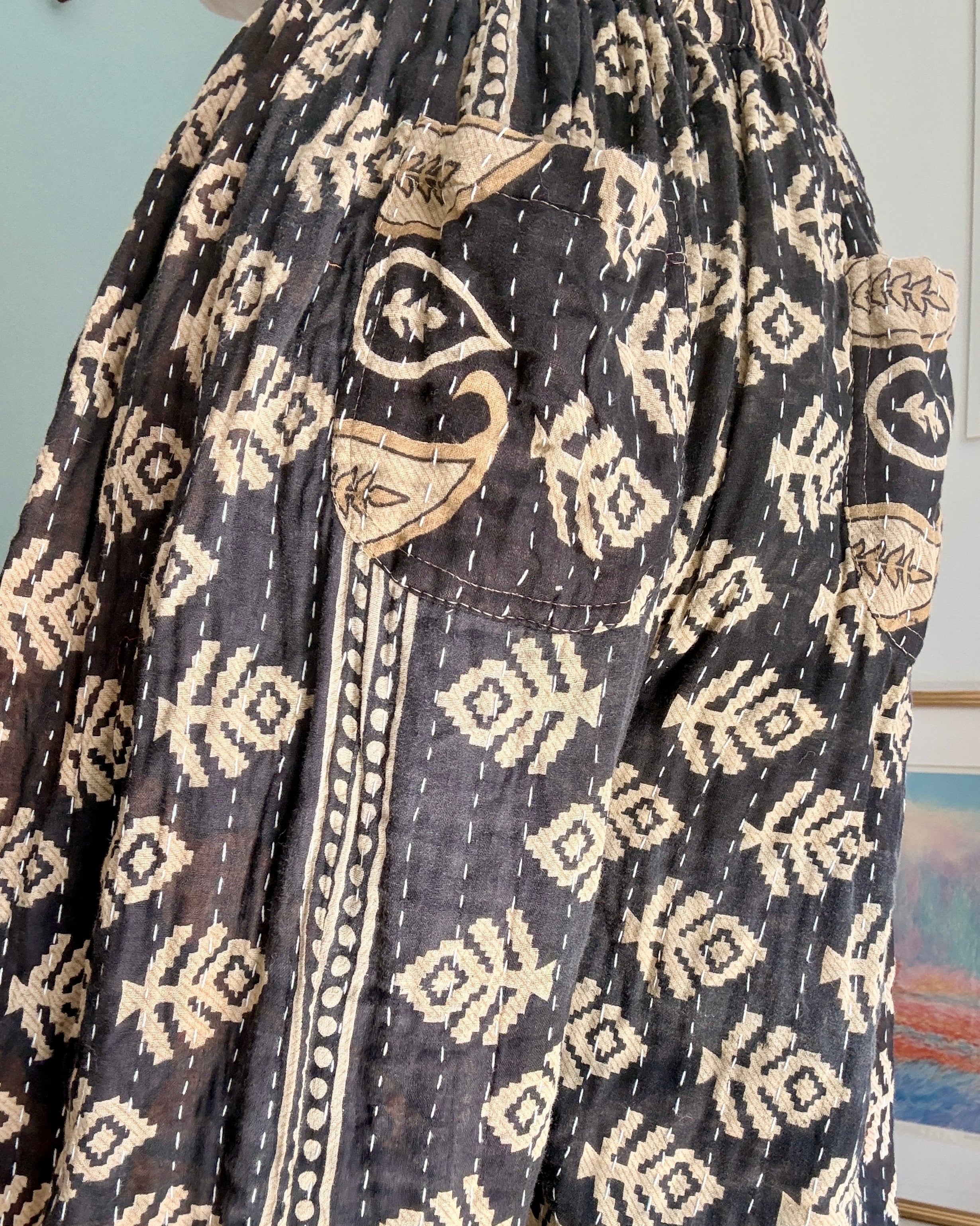 ヴィンテージコットンサリーを3〜4枚重ねて刺し子した、厚手タイプのアラジンパンツです✴︎