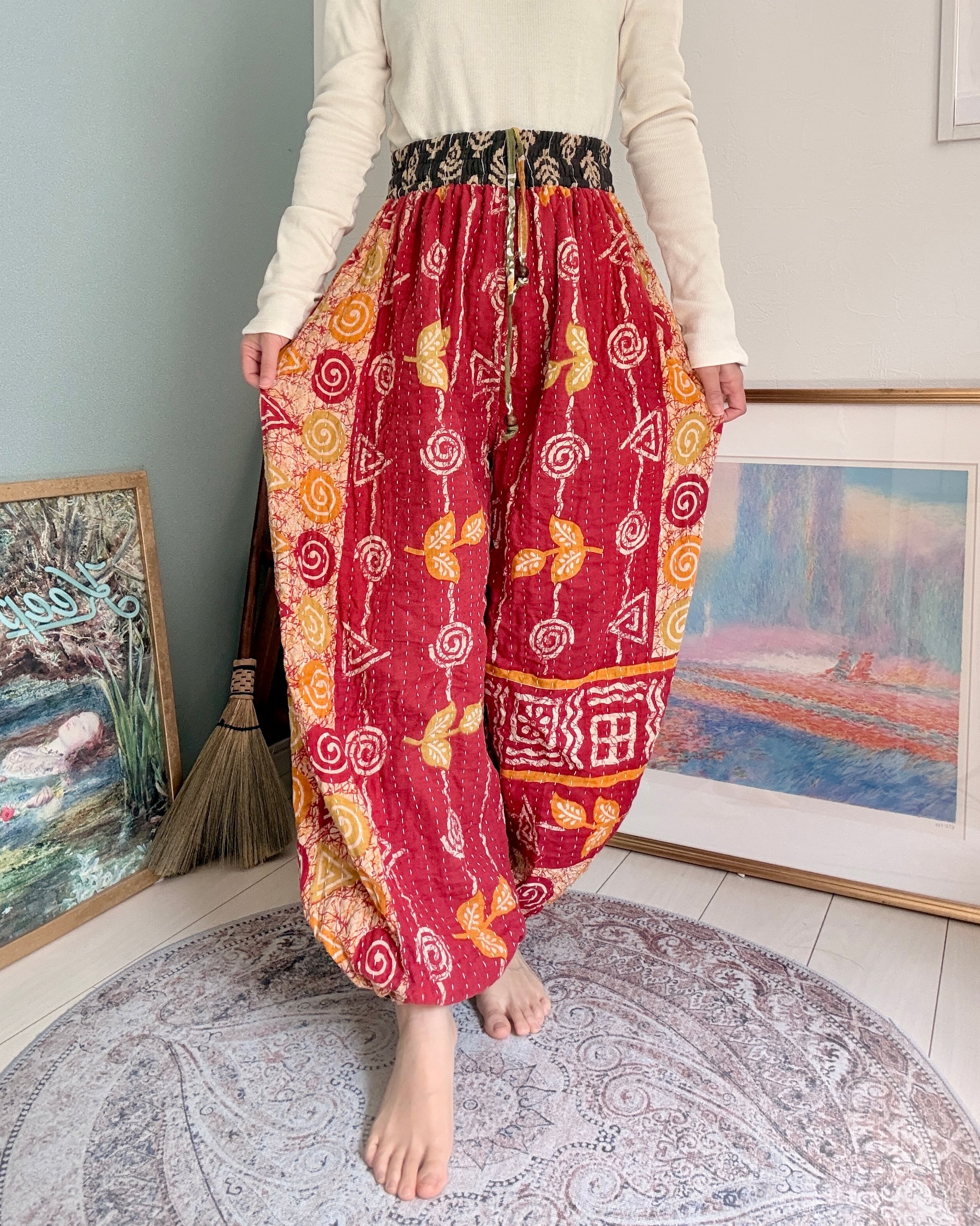 Thick type Aladdin trousers sewn with 3-4 layers of vintage cotton saris. ✴︎