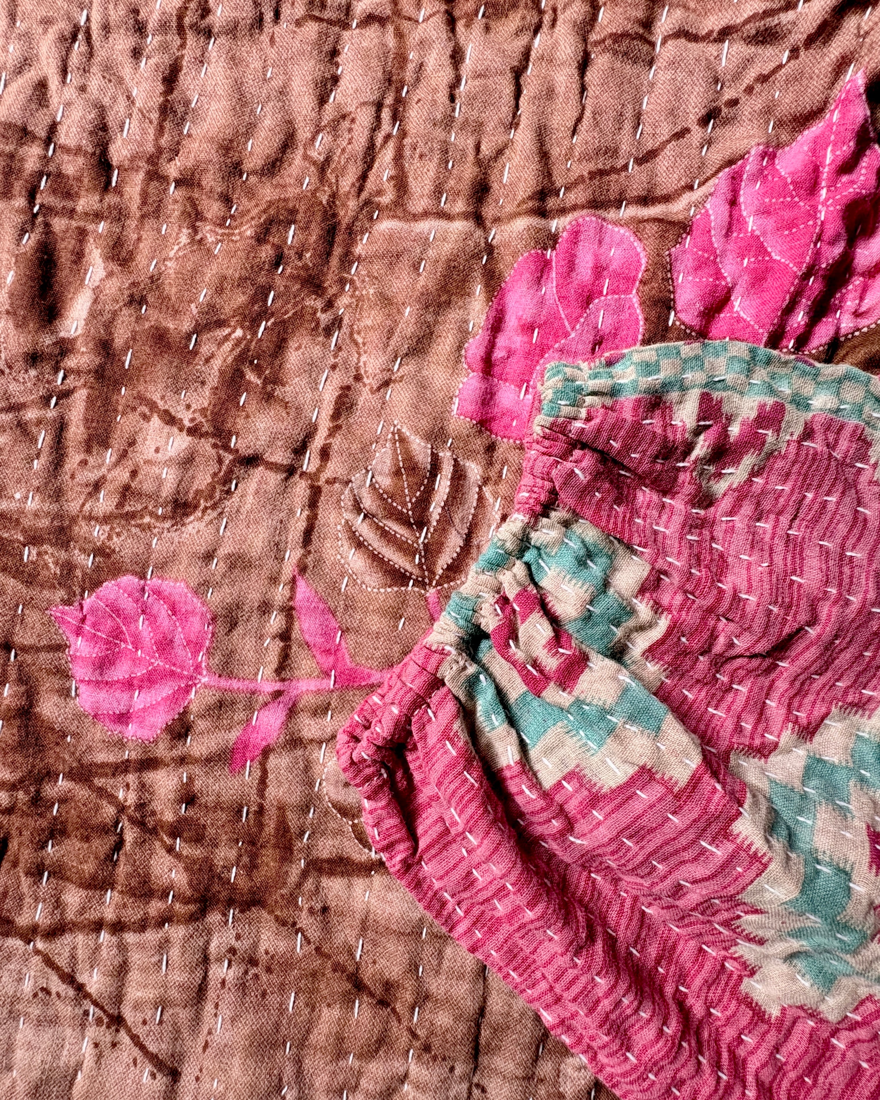 The central panel is made from layered cotton sari fabric, hand-stitched with traditional kantha techniques, offering a soft texture with no transparency.